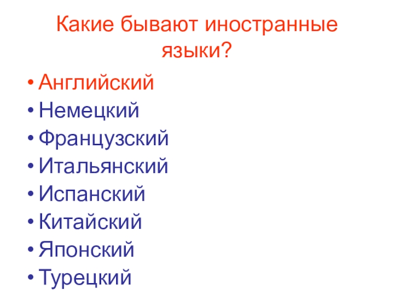 Какие бывают иностранные языки?АнглийскийНемецкийФранцузскийИтальянскийИспанскийКитайскийЯпонскийТурецкий