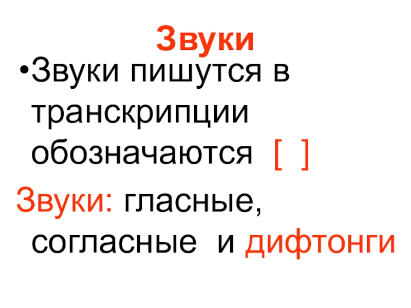 ЗвукиЗвуки пишутся в транскрипции обозначаются [ ]Звуки: гласные, согласные и дифтонги