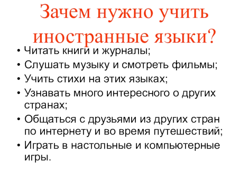 Зачем нужно учить иностранные языки?Читать книги и журналы;Слушать музыку и смотреть фильмы;Учить стихи на этих языках;Узнавать много