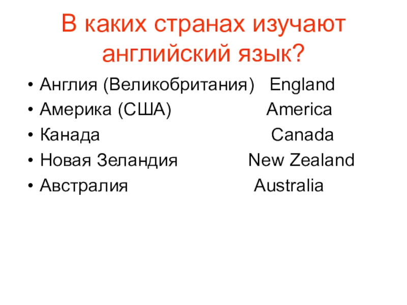В каких странах изучают английский язык?Англия (Великобритания)  EnglandАмерика (США)