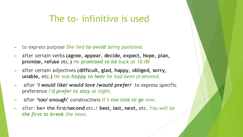The to- infinitive is usedto express purpose She lied to avoid being punished.after certain verbs (agree, appear, decide, expect, hope, plan, promise, refuse etc.) He promised to be back at 10.00after certain adjectives (difficult, glad, happy,