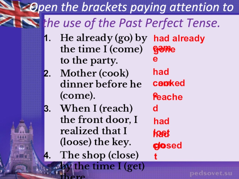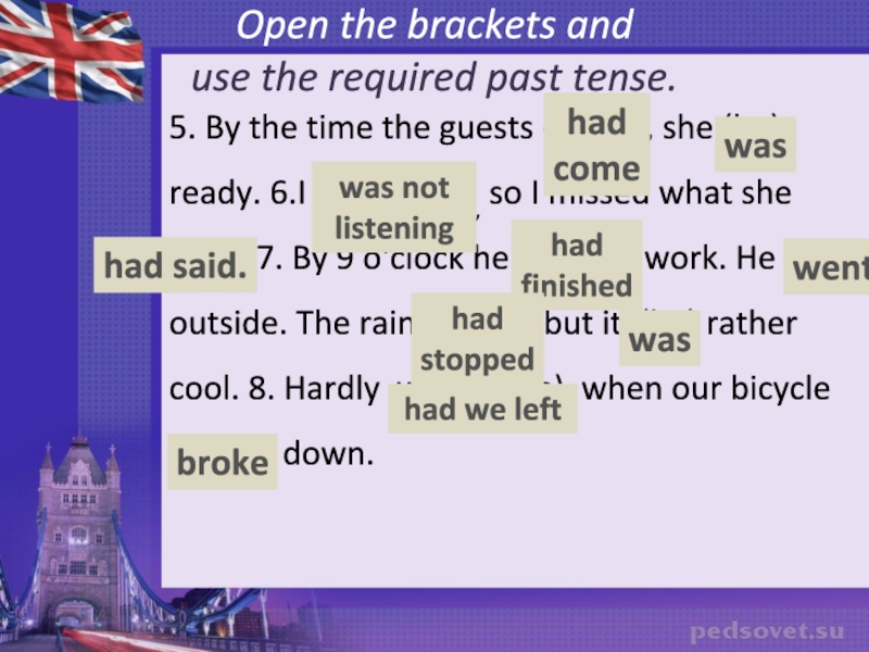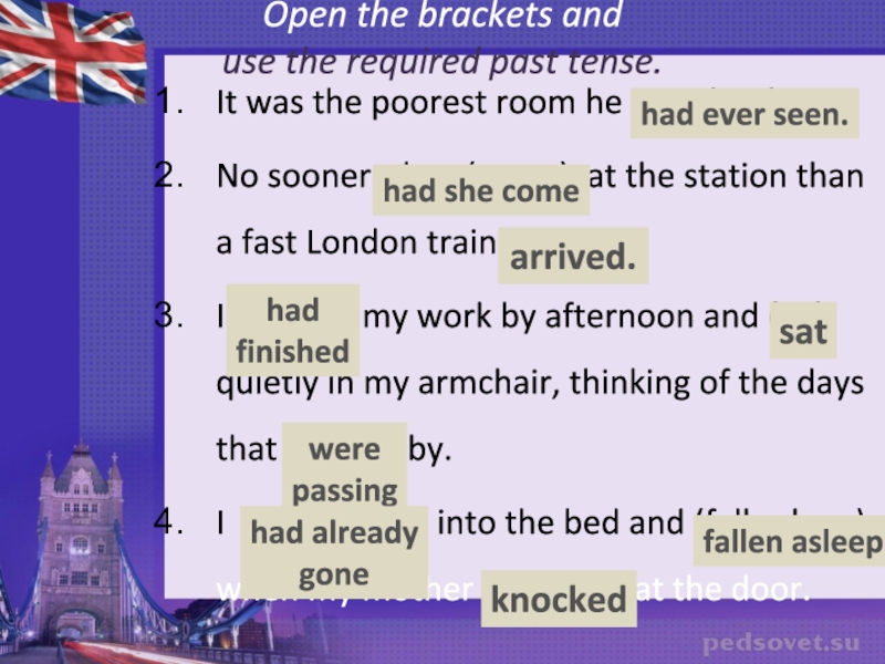 7. When I (come), he already (come) and (sit) near the fireplace looking through a magazine.
