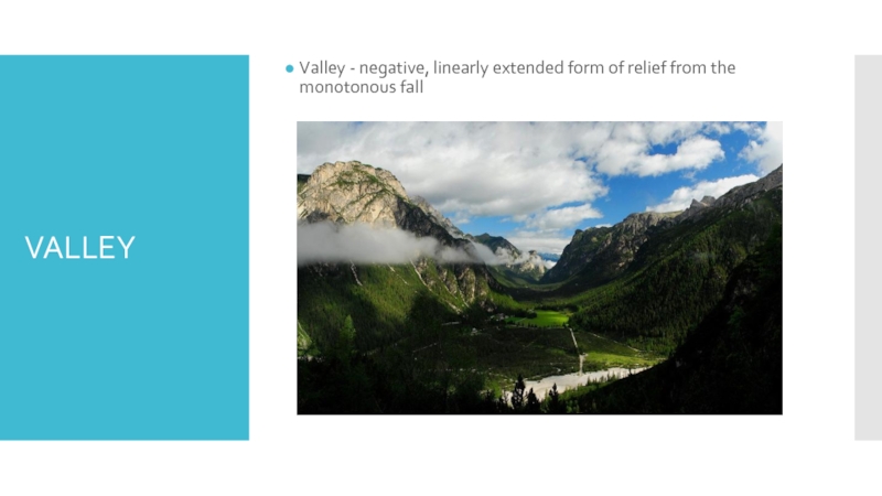 VALLEYValley - negative, linearly extended form of relief from the monotonous fall