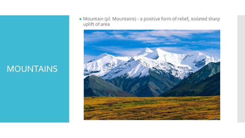 MOUNTAINSMountain (pl. Mountains) - a positive form of relief, isolated sharp uplift of area