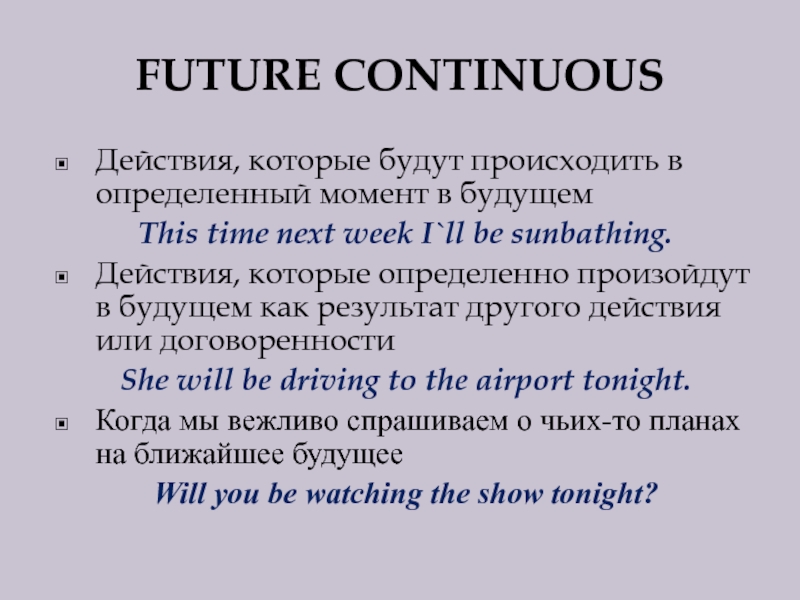 FUTURE CONTINUOUSДействия, которые будут происходить в определенный момент в будущемThis time next week I`ll be sunbathing.Действия, которые