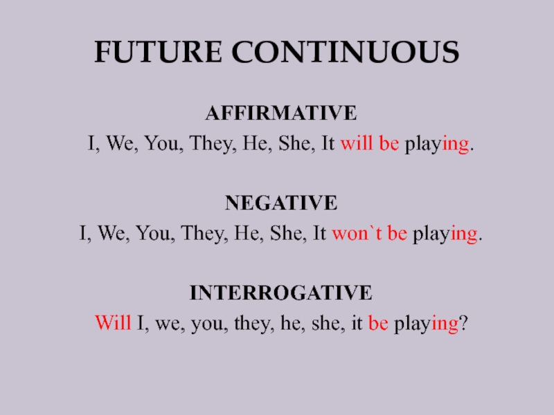 FUTURE CONTINUOUSAFFIRMATIVEI, We, You, They, He, She, It will be playing.NEGATIVEI, We, You, They, He, She, It