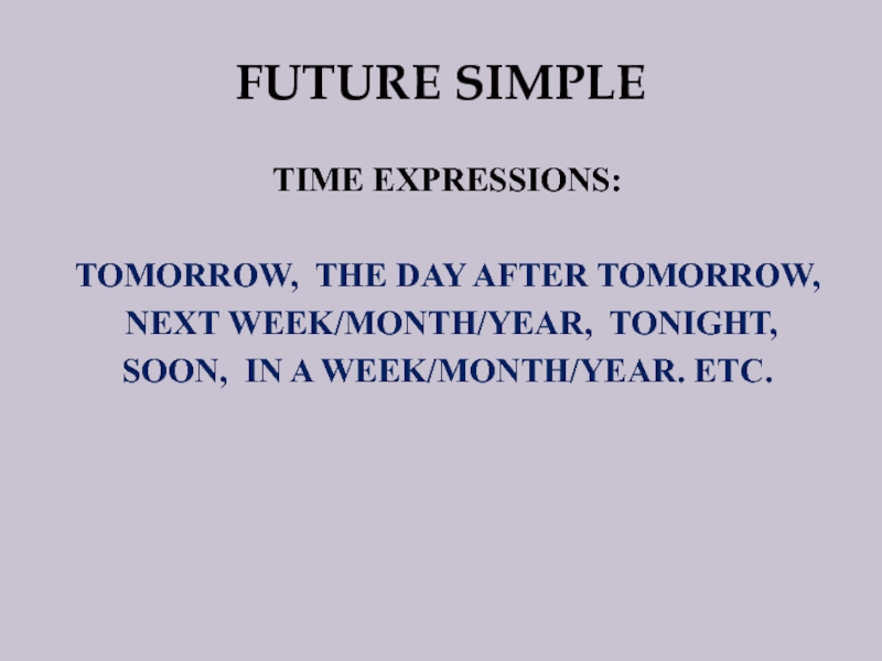 FUTURE SIMPLETIME EXPRESSIONS:TOMORROW, THE DAY AFTER TOMORROW, NEXT WEEK/MONTH/YEAR, TONIGHT, SOON, IN A WEEK/MONTH/YEAR. ETC.