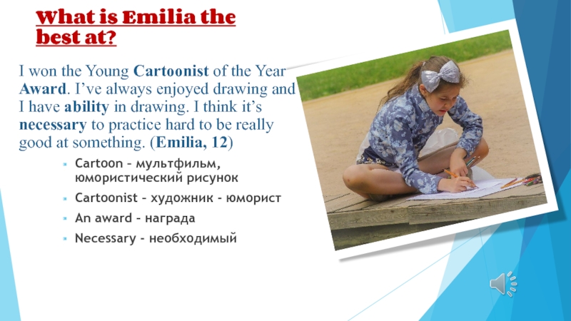 Emilia is not interested in drawing cartoons.