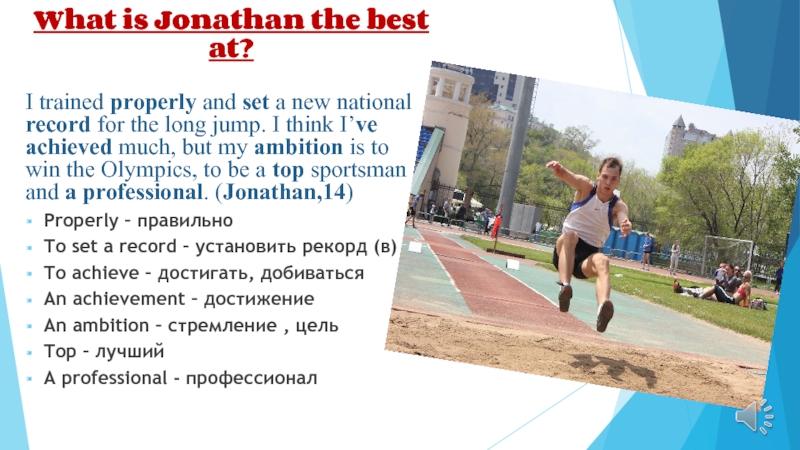 Jonathan wants to compete in the Olympics and to be a good sportsman.