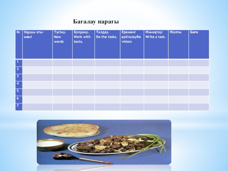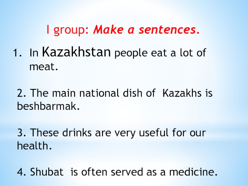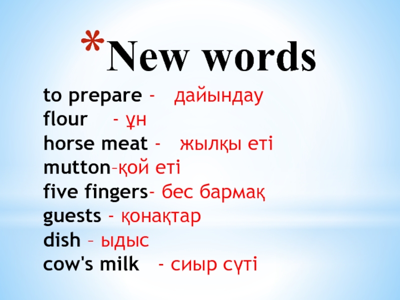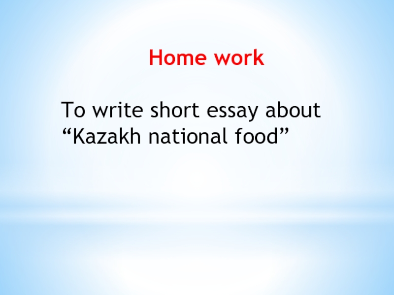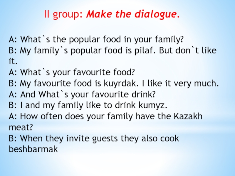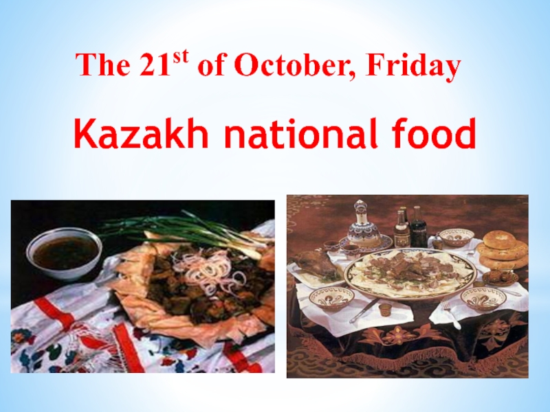 meat. Their traditional food is the Kazakh meat. Kazakh people are very hospitable. When they invite guests they also cookbeshbarmak, pilaf, kazy, kuyrdak. The main national dish of Kazakhs is beshbarmak. Kazakh people prepared Beshbarmak frommutton, a horse - beef. Besbarmak - a dish eaten with five fingers.Bauyrsak - national dish of Kazakhs, prepared from flour.The tastiest horse meat dishes are zhal, zhaya, kazy, and karta,shuzhuk.