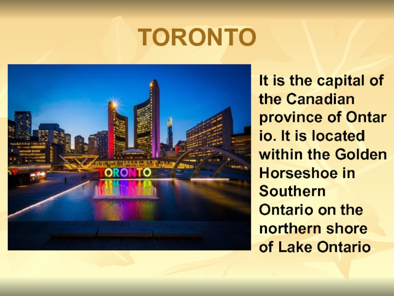It is the capital of the Canadian province of Ontario. It is located within the Golden Horseshoe in