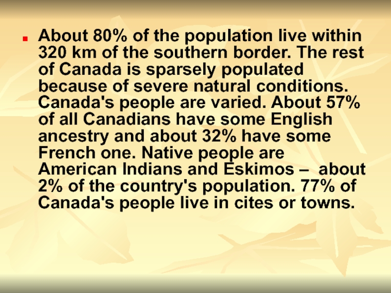 southern border. The rest of Canada is sparsely populated because of severe natural conditions. Canada's people are varied. About 57% of all Canadians have some English ancestry and about 32% have some French one. Native people are American Indians and Eskimos – about 2% of the country's population. 77% of Canada's people live in cites or towns.