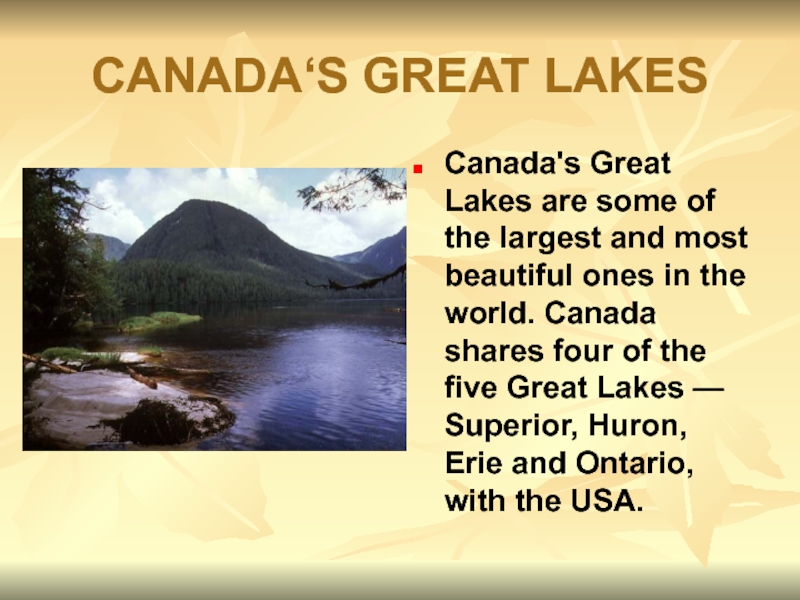 most beautiful ones in the world. Canada shares four of the five Great Lakes — Superior, Huron, Erie and Ontario, with the USA.