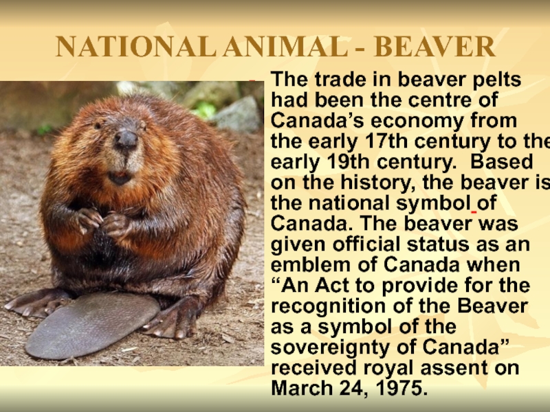 centre of Canada’s economy from the early 17th century to the early 19th century. Based on the history, the beaver is the national symbol of Canada. The beaver was given official status as an emblem of Canada when “An Act to provide for the recognition of the Beaver as a symbol of the sovereignty of Canada” received royal assent on March 24, 1975.