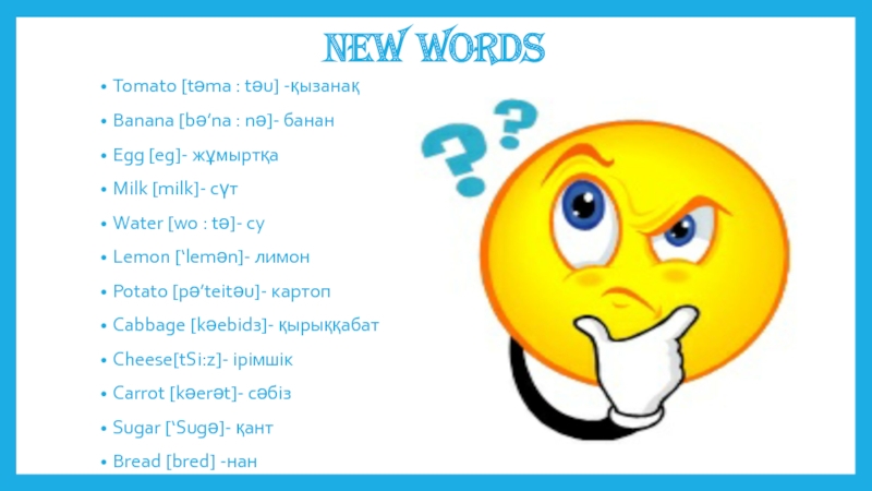 New wordsTomato [tәma : tәu] -қызанақBanana [bә’na : nә]- бананEgg [eg]- жұмыртқаMilk [milk]- сүтWater [wo : tә]-