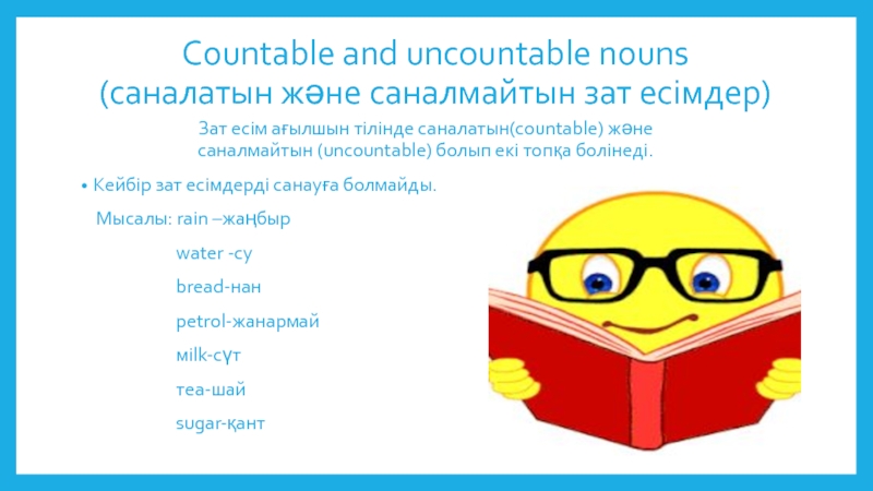 Слайд 9Countable and uncountable nouns (саналатын және саналмайтын зат есімдер)