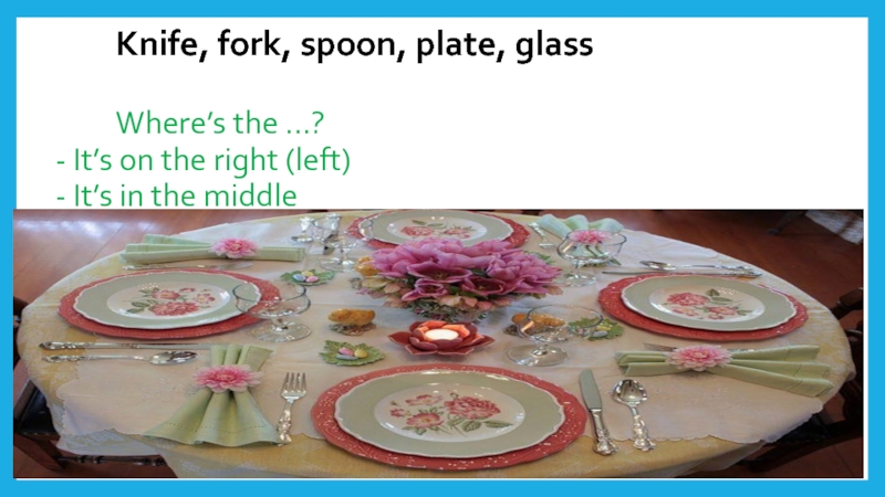 Knife, fork, spoon, plate, glass      Where’s the ...?