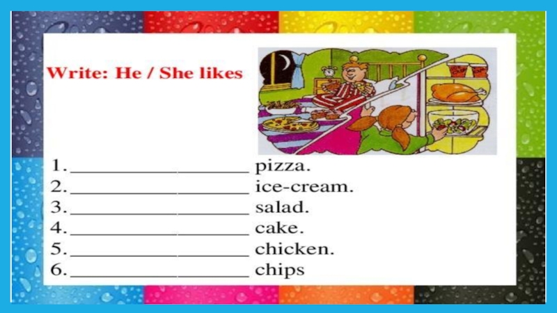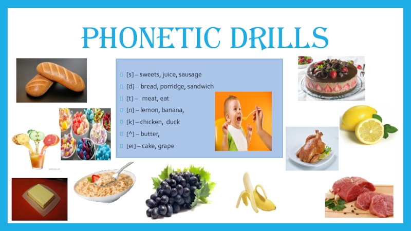 Phonetic drills[s] – sweets, juice, sausage [d] – bread, porridge, sandwich[t] –   meat, eat[n] – lemon, banana,