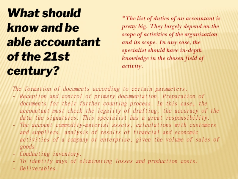 *The list of duties of an accountant is pretty big. They largely depend on the scope of activities of the organization and its scope. In any case, the specialist should have in-depth knowledge in the chosen field of activity.