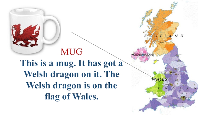 This is a mug. It has got a Welsh dragon on it. The Welsh dragon is on the flag of Wales.