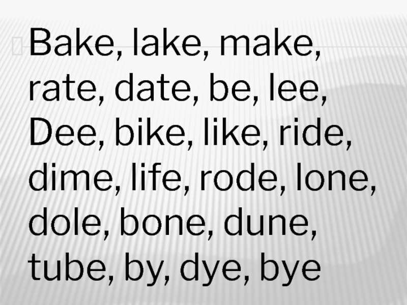 Слайд 11Bake, lake, make, rate, date, be, lee, Dee, bike, like, ride,