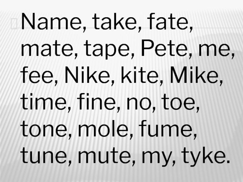 Слайд 10Name, take, fate, mate, tape, Pete, me, fee, Nike, kite, Mike,