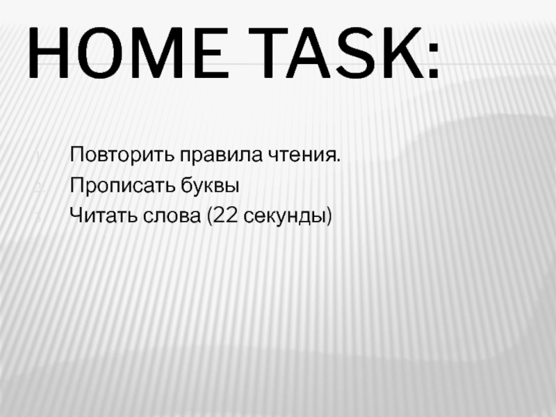 Home task:Повторить правила чтения.Прописать буквыЧитать слова (22 секунды)