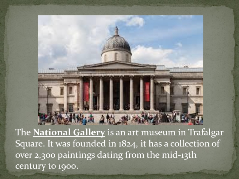 Слайд 10The National Gallery is an art museum in Trafalgar Square. It was founded in 1824, it