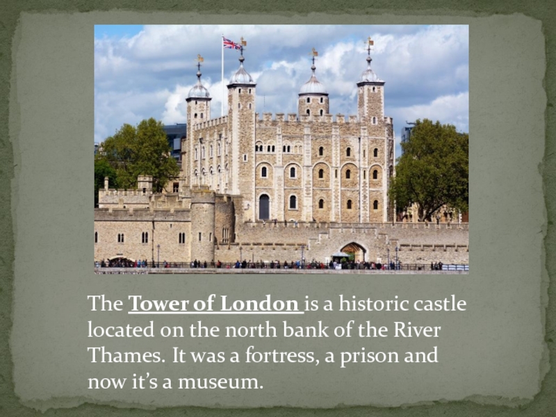 Слайд 5The Tower of London is a historic castle located on the north bank