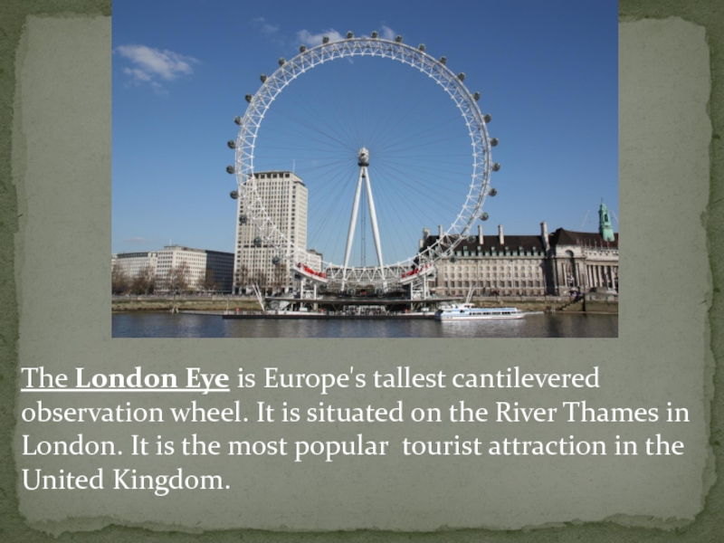 Слайд 13The London Eye is Europe's tallest cantilevered observation wheel. It is situated on