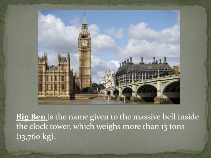Слайд 4Big Ben is the name given to the massive bell inside the clock