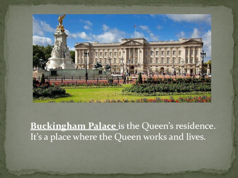 Слайд 6Buckingham Palace is the Queen’s residence. It’s a place where the