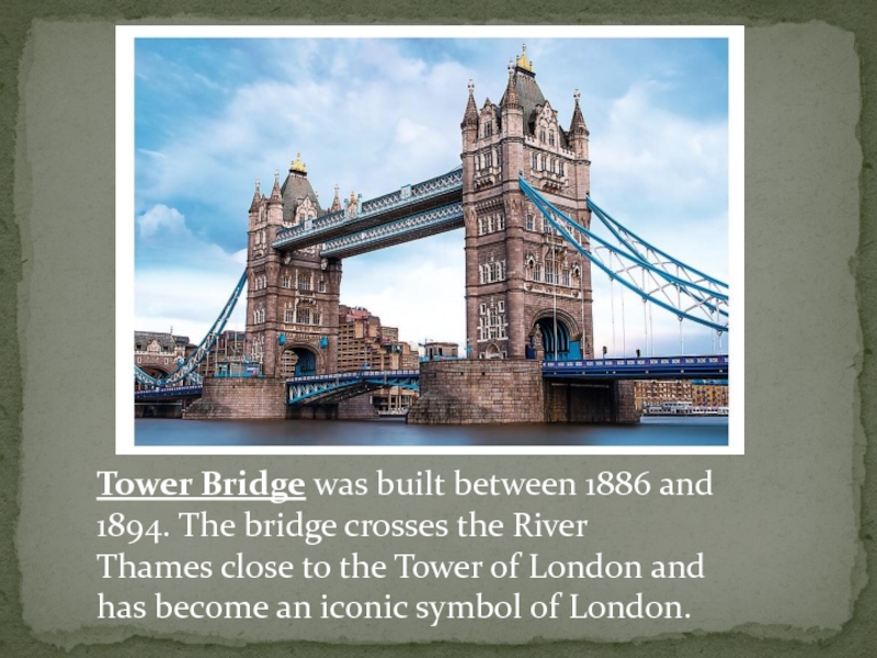 Слайд 11Tower Bridge was built between 1886 and 1894. The bridge crosses the River