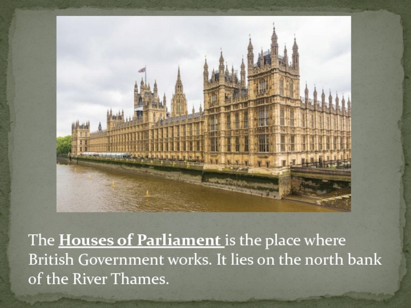 The Houses of Parliament is the place where British Government works. It lies on the north bank of