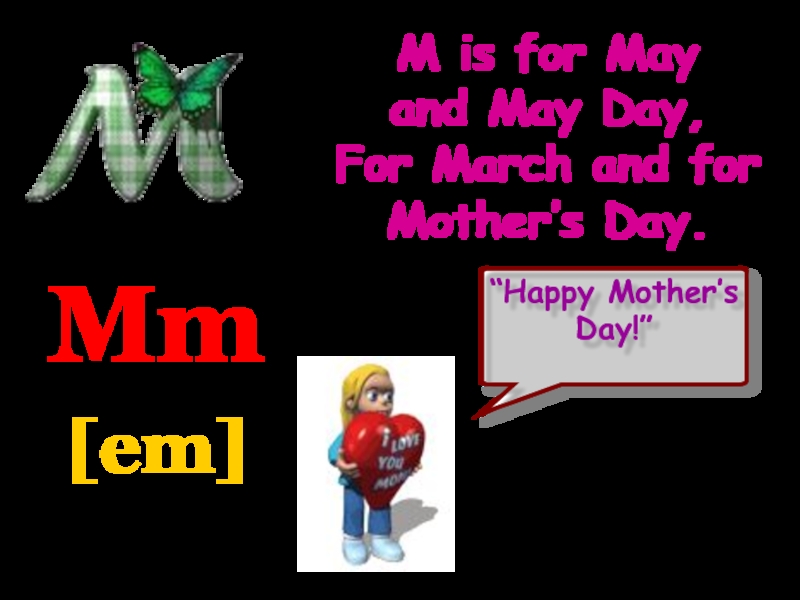 M is for May  and May Day, For March and for Mother’s Day.Mm [em] “Happy Mother’s