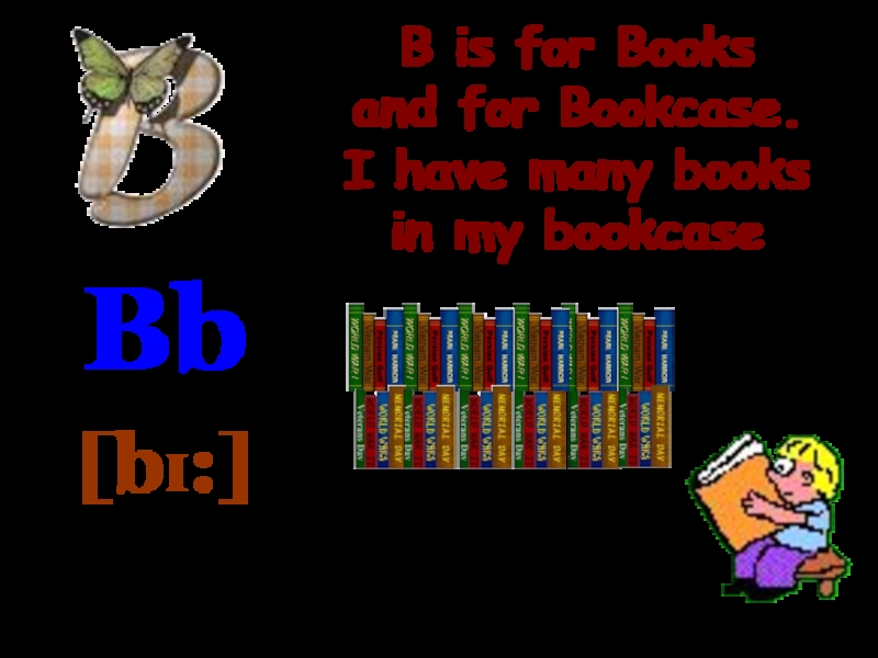 B is for Books and for Bookcase. I have many books in my bookcaseBb[bɪ:]