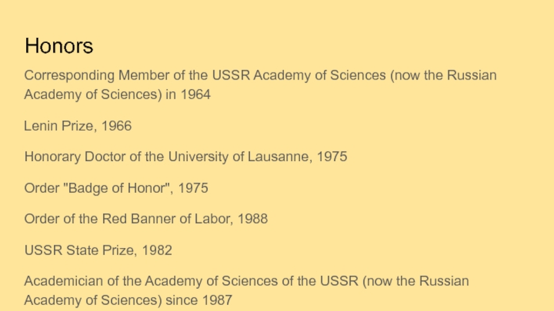 HonorsCorresponding Member of the USSR Academy of Sciences (now the Russian Academy of Sciences) in 1964Lenin Prize,