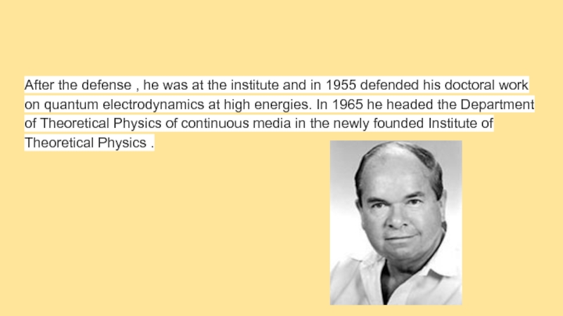 1955 defended his doctoral work on quantum electrodynamics at high energies. In 1965 he headed the Department of Theoretical Physics of continuous media in the newly founded Institute of Theoretical Physics .