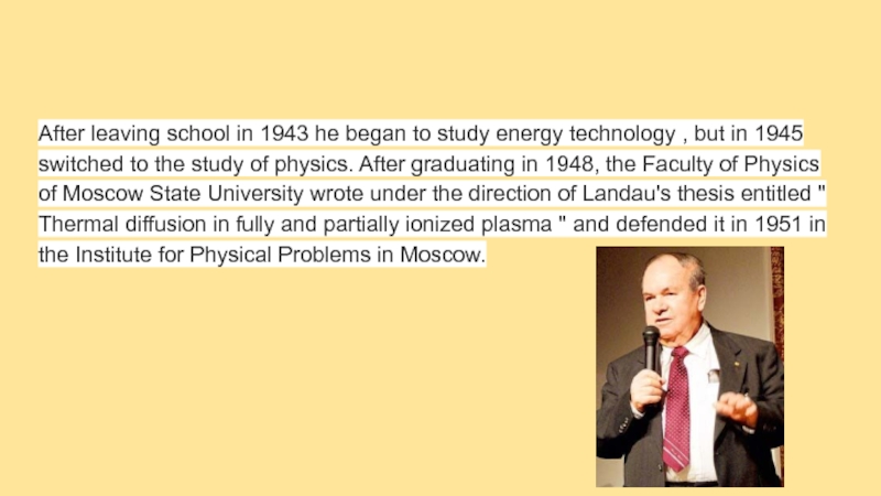 , but in 1945 switched to the study of physics. After graduating in 1948, the Faculty of Physics of Moscow State University wrote under the direction of Landau's thesis entitled " Thermal diffusion in fully and partially ionized plasma " and defended it in 1951 in the Institute for Physical Problems in Moscow.