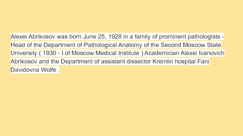 Alexei Abrikosov was born June 25, 1928 in a family of prominent pathologists - Head of the Department of Pathological Anatomy of the Second Moscow State University ( 1930 - I of Moscow Medical Institute )