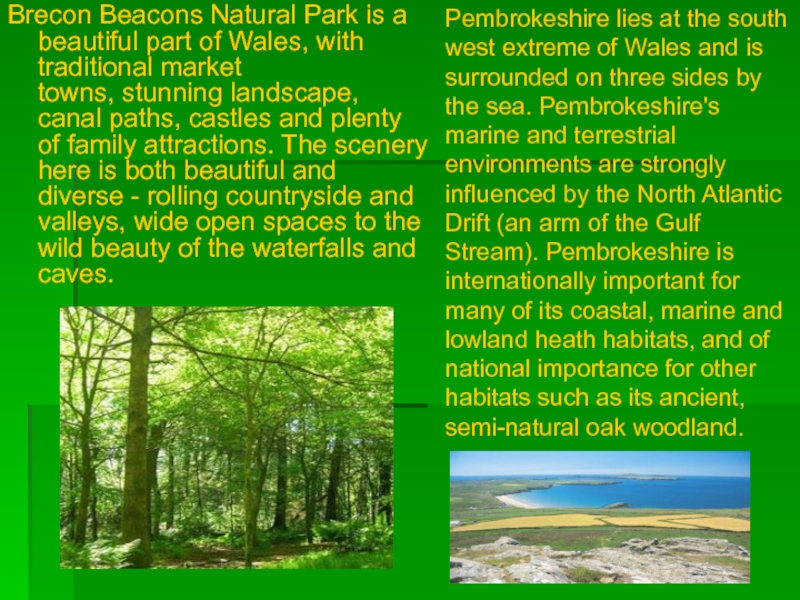 Pembrokeshire lies at the south west extreme of Wales and is surrounded on three sides by the sea. Pembrokeshire's marine and terrestrial environments are strongly influenced by the North Atlantic Drift (an arm of the Gulf Stream). Pembrokeshire is internationally important for many of its coastal, marine and lowland heath habitats, and of national importance for other habitats such as its ancient, semi-natural oak woodland.