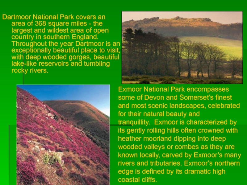 Exmoor National Park encompasses some of Devon and Somerset’s finest and most scenic landscapes, celebrated for their natural beauty and tranquillity. Exmoor is characterized by its gently rolling hills often crowned with heather moorland dipping into deep wooded valleys or combes as they are known locally, carved by Exmoor’s many rivers and tributaries. Exmoor’s northern edge is defined by its dramatic high coastal cliffs.