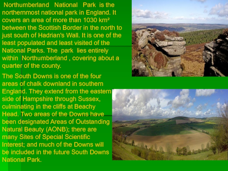 The South Downs is one of the four areas of chalk downland in southern England. They extend from the eastern side of Hampshire through Sussex, culminating in the cliffs at Beachy Head. Two areas of the Downs have been designated Areas of Outstanding Natural Beauty (AONB); there are many Sites of Special Scientific Interest; and much of the Downs will be included in the future South Downs National Park.