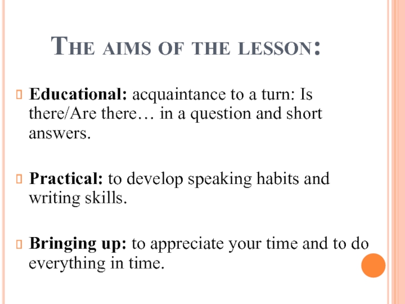 The aims of the lesson:Educational: acquaintance to a turn: Is there/Are there… in a question and short answers.Practical: to develop speaking habits and writing skills.Bringing up: to appreciate your time and to do everything in time.