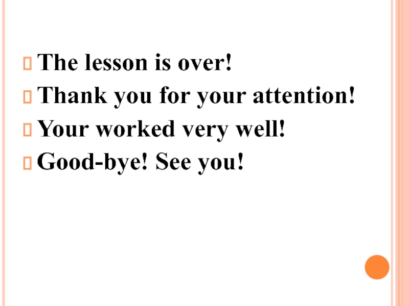 The lesson is over!Thank you for your attention!Your worked very well!Good-bye! See you!