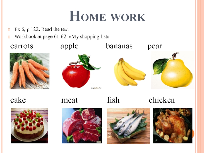 Home workEx 6, p 122. Read the textWorkbook at page 61-62. «My shopping list» carrots