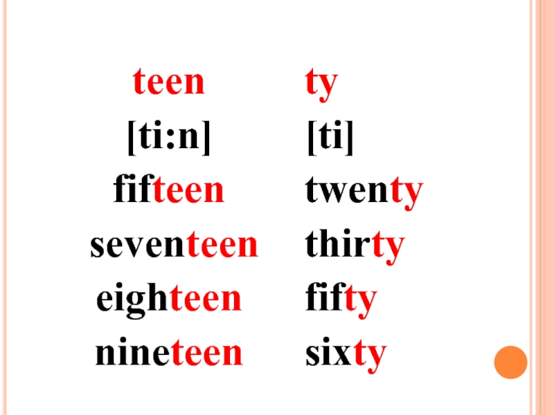 teen [ti:n]fifteen seventeeneighteennineteen ty [ti]twentythirtyfiftysixty