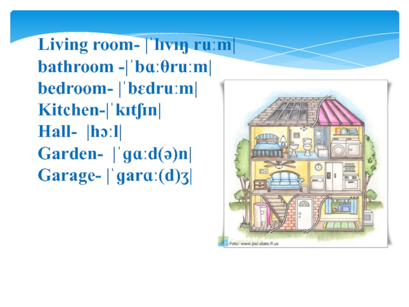 Слайд 9Living room- |ˈlɪvɪŋ ruːm| bathroom -|ˈbɑːθruːm| bedroom- |ˈbɛdruːm|