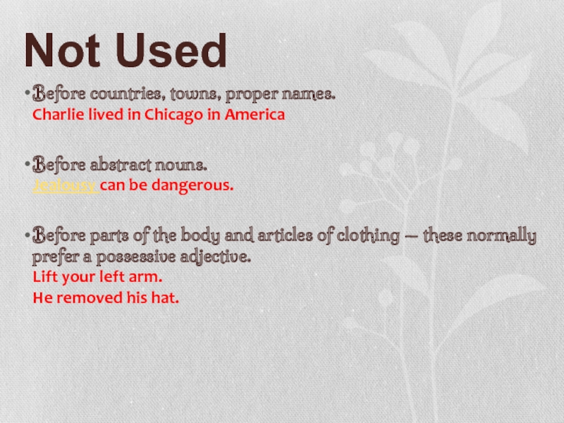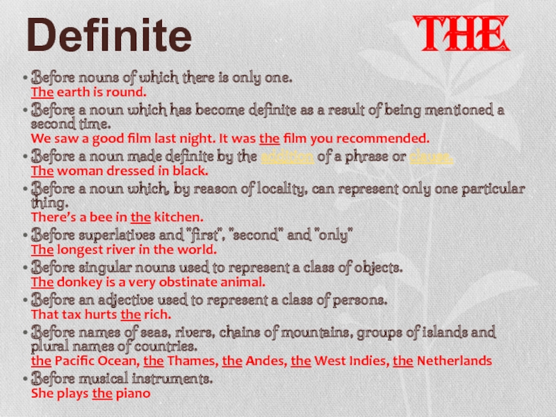 Before names of seas, rivers, chains of mountains, groups of islands and plural names of countries.