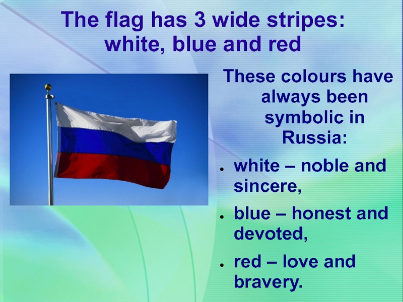 Слайд 11The flag has 3 wide stripes: white, blue and red